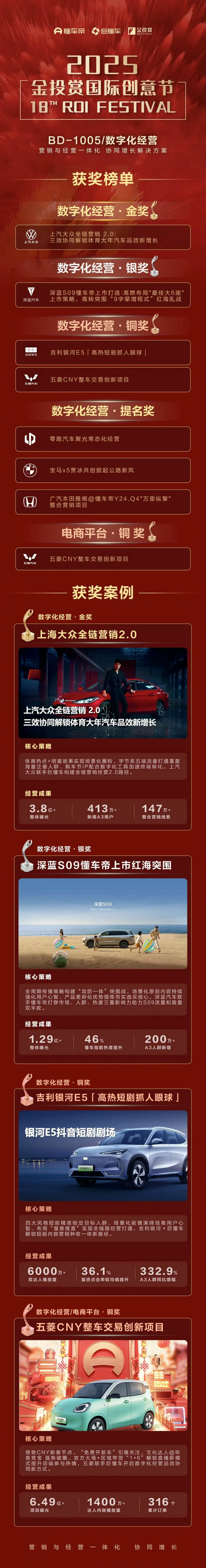 在获奖项目中,《上汽大众全链营销2.0:三效协同解锁体育大年汽车品效新增长》获得金奖;《深蓝S09懂车帝上市打造:高燃布局“最佳大6座”上市策略,高转突围“9字辈增程式”红海乱战》获得银奖;《吉利银河E5〈高热短剧抓人眼球〉》与《五菱CNY整车交易创新项目》获得铜奖;《零跑汽车聚光常态化经营》《宝马X5贾冰共创掀起公路新风》《广汽本田雅阁@懂车帝Y24.Q4“万里纵擎”整合营销项目》获得提名奖。其中,《五菱CNY整车交易创新项目》同时在电商平台赛道中斩获铜奖。