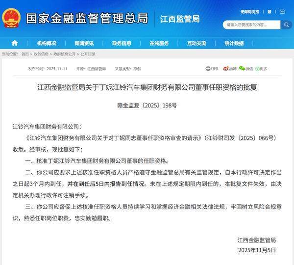 同时,江西金融监管局核准丁妮江铃汽车财务公司董事的任职资格。以下是相关批复正文: