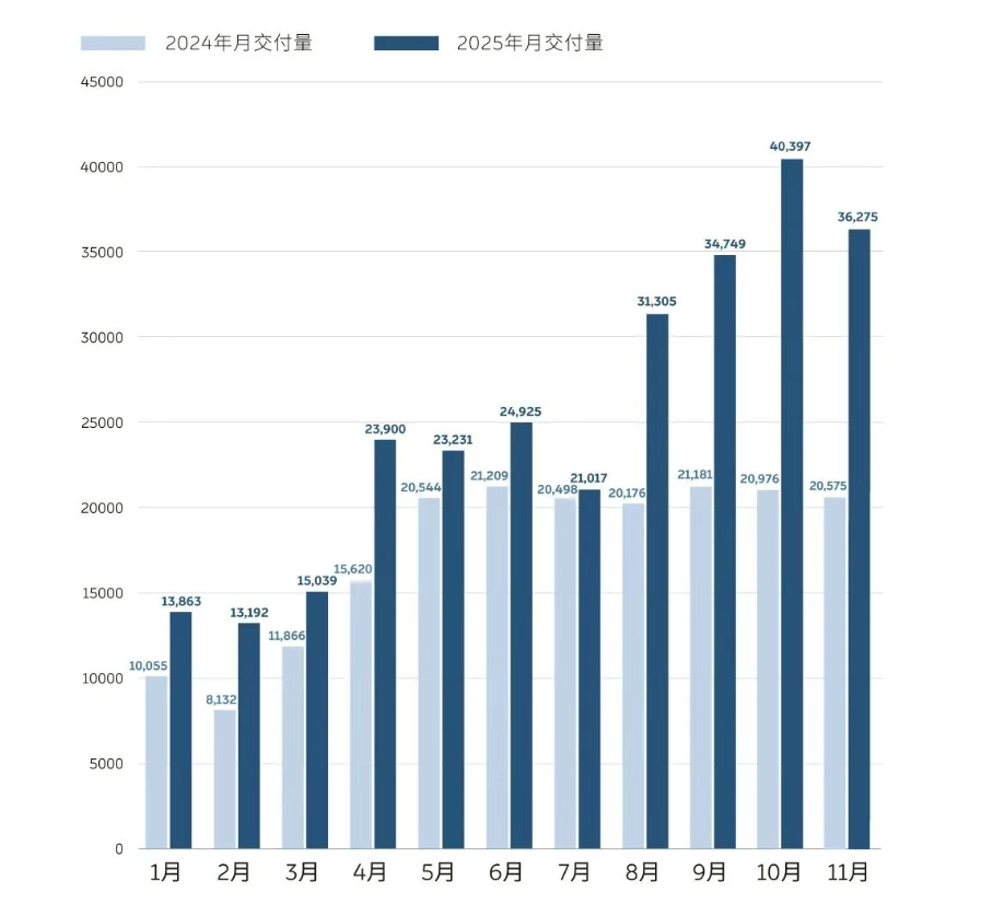 小米汽车11月保持稳定输出,交付量持续超过4万台,已连续三个月维持在这一水平之上。稳定的交付表现反映出其制造与供应链体系的日趋成熟。