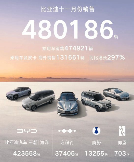 比亚迪11月共销售480186辆,创下年内新高。其中海外销售突破13万辆,同比增长297%,同样创下历史新高。今年1-11月,其累计销售已突破418万辆。