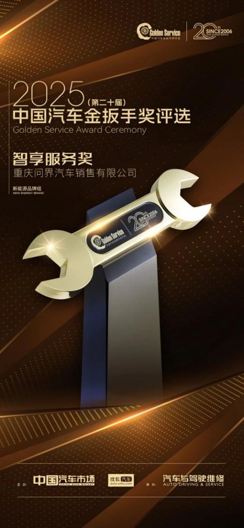 近日,问界在2025(第二十届)中国汽车金扳手奖评选中荣膺“新能源品牌组-智享服务奖”,全国多家用户中心同步入选“金扳手服务百强质选店”。这一行业权威认证,不仅体现了专业机构对其服务能力的高度认可,也反映出市场对问界智享服务的广泛肯定。