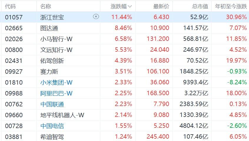 港股市场智能驾驶概念股走强,其中,浙江世宝涨超11%,图达通涨超8%,小马智行-W涨超6%,文远知行-W涨超5%,佑驾创新涨超4%,赛力斯涨超3%,地平线机器人-W涨超2%。消息面上,马斯克在达沃斯世界经济论坛上表示,特斯拉需驾驶员监督的FSD最快或在下个月获得欧洲和中国监管机构批准。