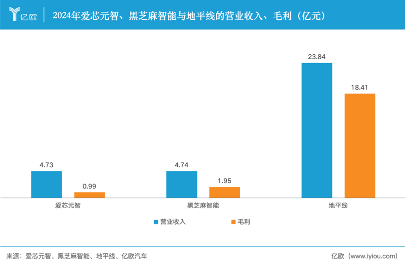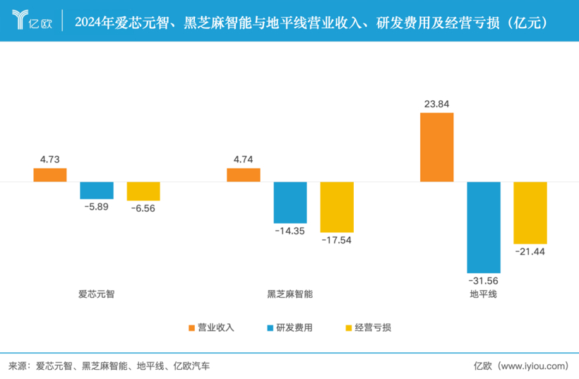 2024年两家公司的营收都在4.7亿元左右,是地平线的两成。这也对应在了二级市场的估值上,地平线总市值已超过1317亿港元,爱芯元智约189.5亿港元,黑芝麻智能则为124.1亿港元。