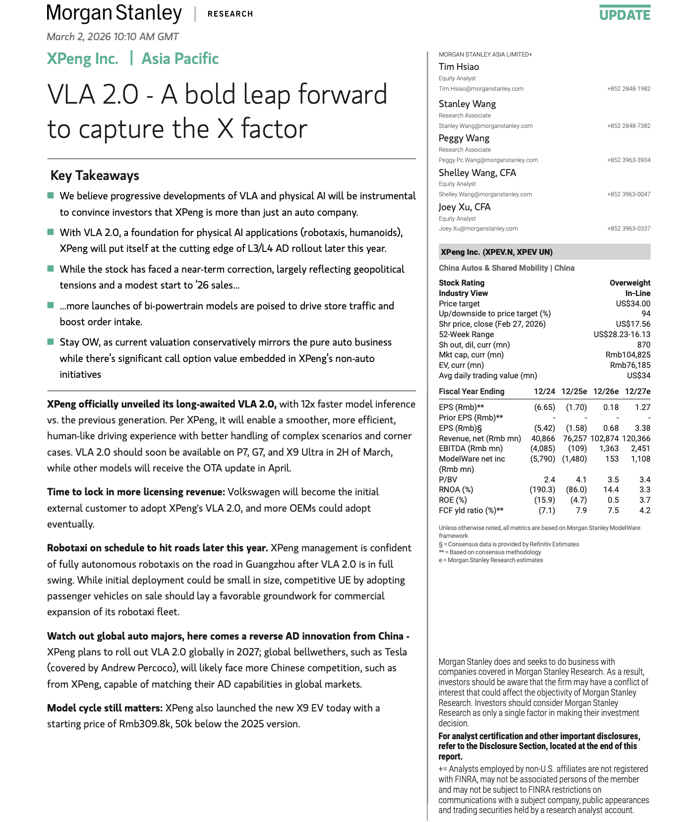 摩根士丹利则在其报告中具体表示,小鹏正式发布第二代VLA模型,相较上一代推理速度提升12倍,并在复杂场景处理和边缘场景应对方面实现显著提升。该机构认为,这一技术进展为更高等级自动驾驶落地奠定基础,也为Robotaxi等物理AI应用场景提供支撑。