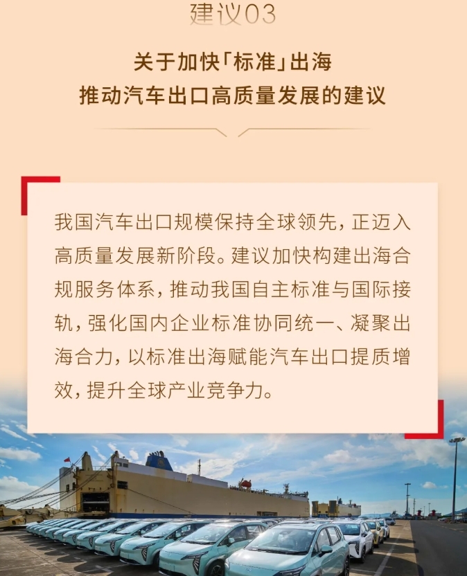 全国人大代表、广汽集团董事长冯兴亚建议,加快“标准”出海,推动汽车出口高质量发展。他表示,我国汽车出口规模保持全球领先,正迈入高质量发展新阶段,建议加快构建出海合规服务体系,推动我国自主标准与国际接轨,强化国内企业标准协同统一、凝聚出海合力,以标准出海赋能汽车出口提质增效,提升全球产业竞争力。