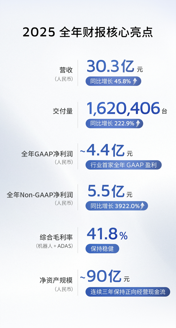 更值得关注的是,得益于强劲的收入增长、严格的成本管控以及 AI 技术推动研发、制造及运营全链路效率的提升,禾赛经营杠杆显著改善,2025 年成为行业首个全年 GAAP 盈利的企业,全年 GAAP 净利润达人民币 4.4 亿元(约合 6,200 万美元),Non-GAAP 净利润达人民币 5.5 亿元(约合 7,900 万美元)。我们已连续 3 个季度实现 GAAP 盈利,并连续 5 个季度实现 Non-GAAP 盈利。与此同时,我们连续三年保持正向经营现金流,净资产规模增长至人民币 90 亿元(约合 13 亿美元)。