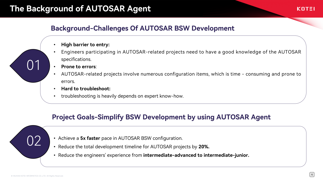 在汽车软件开发中,芯片更换、新车型适配及主机厂定制需求通常需要高级工程师主导,但此类人才市场供给有限。通过将高级工程师的技术经验和行业知识图谱化,AUTOSAR专家Agent可辅助中级工程师完成复杂适配任务,项目初期便设定了开发效率提升5倍、开发周期缩短20%的目标