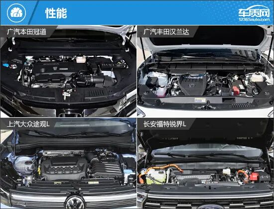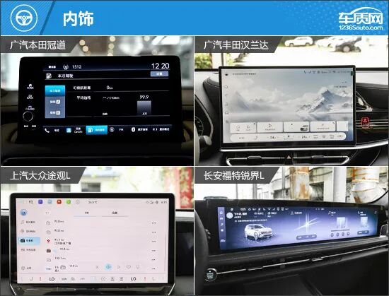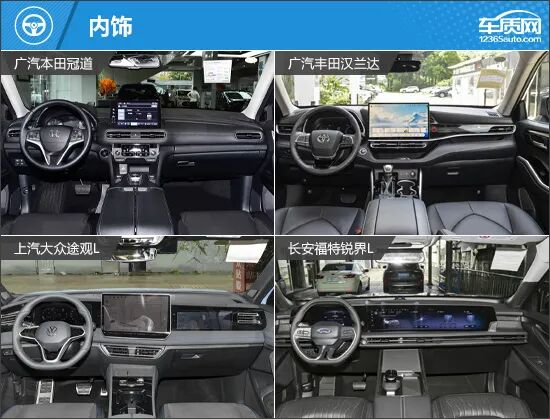 内饰方面,四款车型的风格差异十分明显。广汽本田冠道最为传统,保留了机械仪表盘和大量物理按键,适合偏好经典布局的用户。广汽丰田汉兰达与上汽大众途观L则在简洁与实用之间取得平衡,既保留了传统设计的影子,也融入了当下的科技元素。而长安福特锐界L通过横贯座舱的大连屏设计,营造出接近新能源车型的科技氛围,更显新潮。