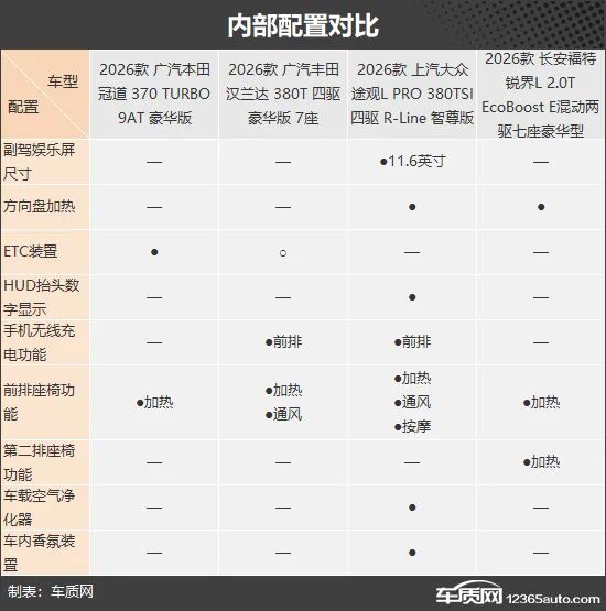 内部配置方面,上汽大众途观L表现较为出色,不仅是四款车中唯一配备副驾娱乐屏和HUD抬头数字显示的车型,在舒适性配置方面也颇具优势;相比之下,广汽本田冠道的配置水平略显朴素,不过其标配ETC装置,在高速出行场景下能够带来更为便捷的使用体验。