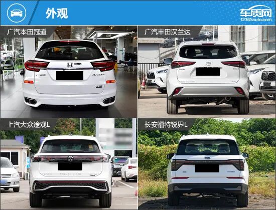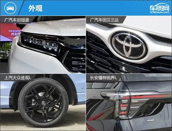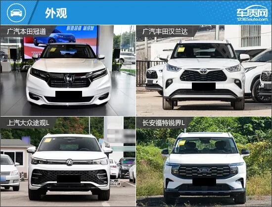 外观方面,四款车型在兼顾家用属性的同时,也展现出了各自鲜明的特征。广汽本田冠道整体造型厚重稳健,飞翼式前脸具有很高的辨识度;广汽丰田汉兰达将力量感与优雅气质相融合,颇具东方审美的平衡感;上汽大众途观L在R-Line外观套件加持下,运动气息更为浓郁;长安福特锐界L则将美式SUV的粗犷气质展现得十分到位,整车线条富有很强的肌肉感。