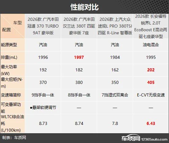 性能方面,除长安福特锐界L采用油电混合动力外,其余三款车型为传统燃油形式。具体来看,四款车型均搭载2.0T发动机,其中长安福特锐界L表现最为突出,不仅动力参数明显领先,在WLTC综合油耗方面也更具优势。而广汽本田冠道则凭借悬架软硬调节功能,在行驶舒适性方面更胜一筹。