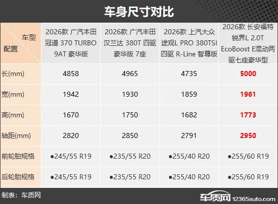 车身尺寸方面,长安福特锐界L在四项数据上全面领先,在乘坐空间和装载能力方面具备明显优势。而上汽大众途观L虽然同样能够满足日常家用需求,但相比另外三款车整体表现略显逊色。