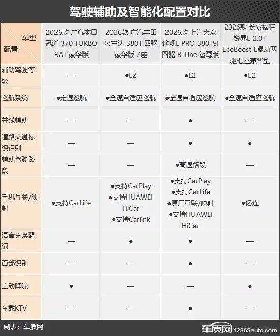 智能化方面,上汽大众途观L同样占据优势,在人机交互能力和交互方式上更为多样,并且是唯一支持车载KTV的车型,娱乐体验更加丰富。而广汽本田冠道和长安福特锐界L虽然手机互联/映射方式相对单一,但均配备主动降噪功能,有助于提升车内的行驶静谧性。