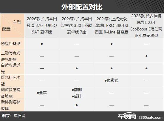 在外部配置方面,四款车各有优势。广汽本田冠道全车提供侧窗多层隔音玻璃,静谧性表现良好;广汽丰田汉兰达则独享后排侧隐私玻璃,私密性更佳;此外,上汽大众途观L配备像素式大灯,而长安福特锐界L搭载主动闭合式进气格栅,也展现了自身的技术特色。