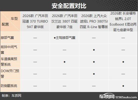 安全配置方面,上汽大众途观L的整体表现更为全面,并是唯一配备前排中间气囊和DOW开门预警的车型;广汽丰田汉兰达与长安福特锐界L也各自拥有独有功能,表现同样可圈可点。相比之下,广汽本田冠道安全配置缺失较多,略显遗憾。