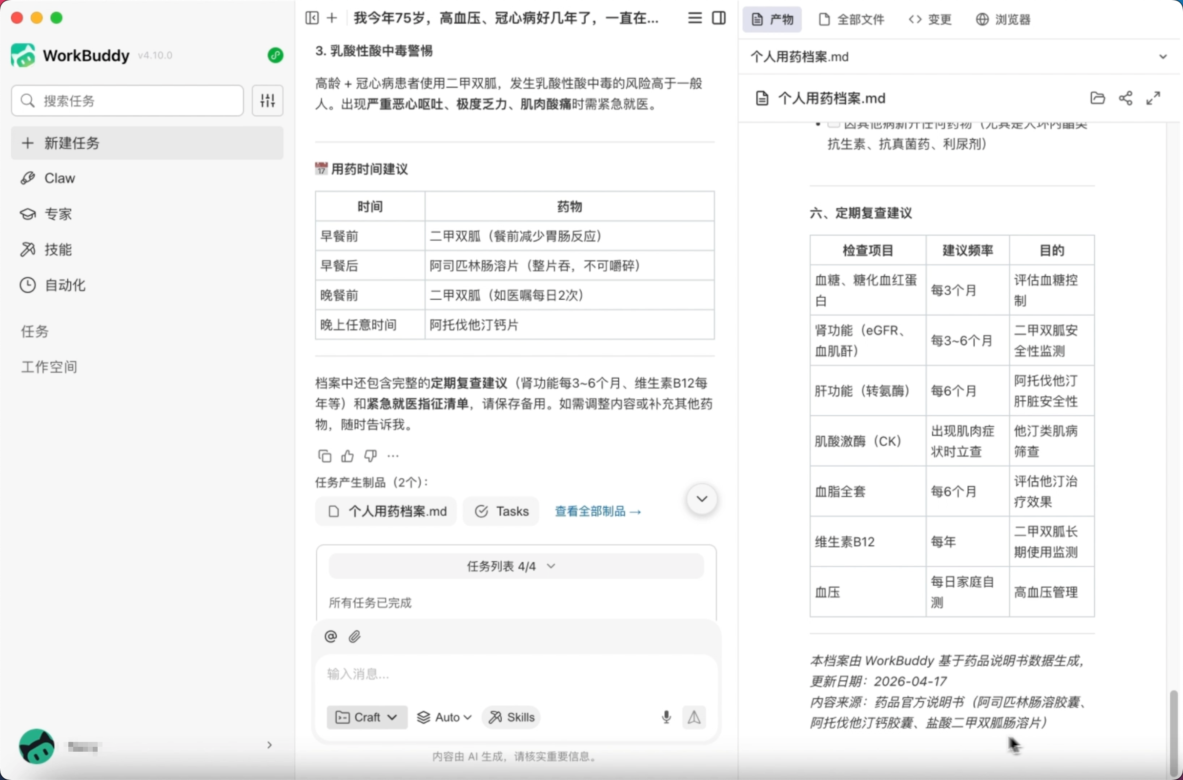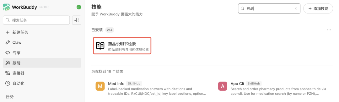 针对这一痛点,WorkBuddy药品说明书Skill将专业的医学知识转化为每个人都能听懂的“用药大白话”,以AI助力药品信息服务更好流转: