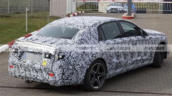 车身侧面,测试车配备了传统的侧拉式车门把手,21英寸轮毂搭配较低的离地间隙,营造出很强的战斗姿态。车尾部分采用“鸭尾”设计,这意味着其可能不会配备奔驰纯电C级和AMG CLA上的自动升降扰流板。