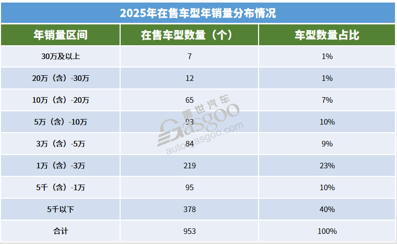 此外,年销量在5000至1万辆之间的车型还有95款,年销量在1万至3万辆之间的车型有219款,换言之,2025年,国内年销量不足3万辆的车型合计占比高达73%,意味着接近四分之三的产品,其实连最基本的规模门槛都未能跨越。