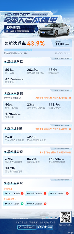 以上就是2025汽车之家冬测项目中比亚迪汉L的全部测试内容,总结来看,它在极寒状态下性能表现足够稳定,同时在空调升温测试中成功荣获全场第一名的好成绩。好了,本期视频就到这里,“冻”真格,讲真话!关注汽车之家冬测,看更多精彩评测内容,我们下期再见。(文/图 汽车之家 张岳男)