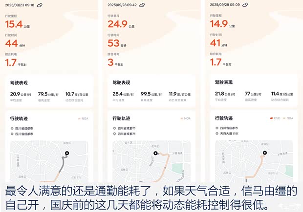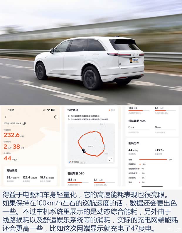 最后就是能耗表现了,这台车经过2000多公里的行驶之后,最近1320公里的平均表显动态能耗是17.5度/100公里,这和前两个月高温天气有一定的关系。因为在9月末的时候这台车在温度适宜的环境下经常能录得12度以下的城市通勤动态能耗,市区通勤能耗非常令人满意。而在高速能耗方面,在基本顶着限速行驶的情况下,232.6公里全程高速录得18.7度的动态能耗和20.2度/100公里的网端充电能耗,能耗表现也比较优异。