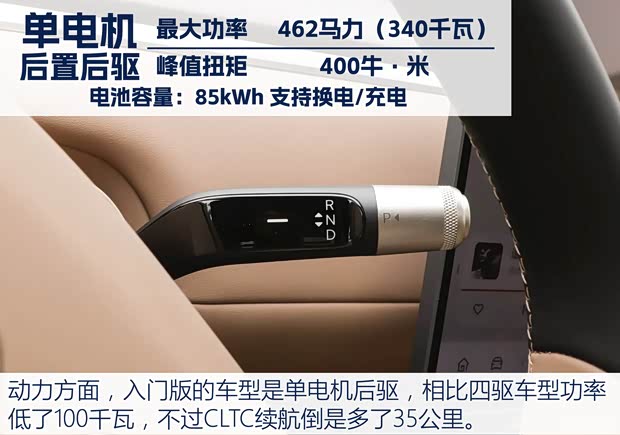 动力和悬架部分应该说是L90 Pro版和其他几个版本之间区别最大的地方了,这台车采用的是单电机后驱的形式。得益于蔚来新平台的优势,后驱电机单元结构紧凑而且出力强悍。后电机峰值功率340千瓦,峰值扭矩400牛·米。官方标称的零百加速只需要5.9秒,其实对一台需要充分照顾乘客乘坐舒适性的家用车来讲这样的动力储备真的已经绰绰有余了。悬架方面,前悬架是双叉臂,后悬架采用多连杆形式,标配了CDC可变悬架。