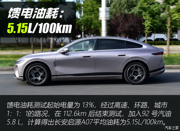 在动态方面,长安启源A07展现出了较好的平衡性,起步轻快且迅速,在城市道路的低速行驶状态下,无论是频繁的启停,还是超车并线,车辆都能轻松应对,动力响应十分积极。需要高速行驶或急加速时,深踩油门,电机与增程器协同工作,有一定的运动感。6.7s的官标加速,在同价位的增程式车型中也算快的。