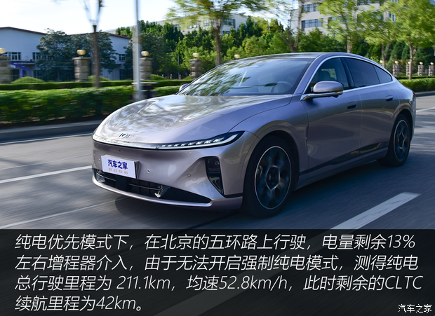 纯电优先模式下绕五环路行驶,剩余电量13%左右时,增程器介入,此时行驶里程211.1km,平均速度52.8km/h。通过计算得出WLTC达成率为93.8%。