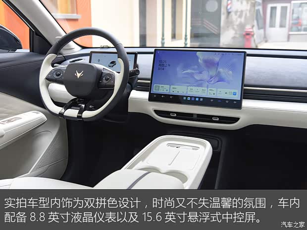 进入车内,同样是简约的设计风格,和外观整体调性保持一致。8.8英寸液晶仪表搭配15.6英寸的悬浮式中控屏,成为内饰最为吸睛的部分,所支持的功能较为丰富,显示效果也不错。