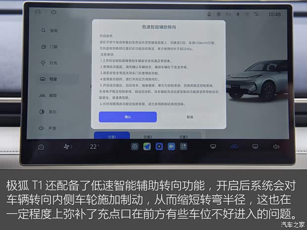 对于一台小型车来说,凭借车身小巧的优势,在城市中能够更自如地穿梭窄路且方便停车。除此之外,极狐T1全系标配360°全景影像,还支持50m循迹倒车以及自动泊车,这可以说是新手的福音,窄路错车或者停车都不必太过紧张。极狐T1还配备了特有的“低速智能辅助转向功能”,这也是同级别车型所不具备的。