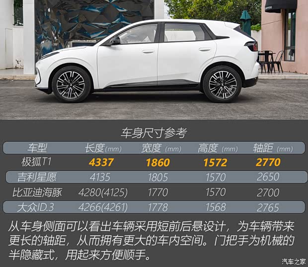 以上就是极狐T1试驾体验的全部内容了,能够感受到它的定位十分清晰明确,主打经济、舒适、家用。不过大家最关心的售价目前还没公布,也不用太着急,极狐T1即将在8月22日正式开启预售。可以参考一下吉利星愿的指导价为6.88-9.78万元,差异在于虽定位同为小型车,极狐T1的尺寸其实比星愿大一些,甚至比级别更高的大众ID.3还要大。由此可见,极狐T1希望通过错位竞争获得更大优势,而最终定价自然就更为关键。那么极狐T1有没有吸引到您呢,您认为它的定价在多少合适呢?欢迎在评论区一起聊聊吧。(文/图/摄 汽车之家 孙嵩韬)