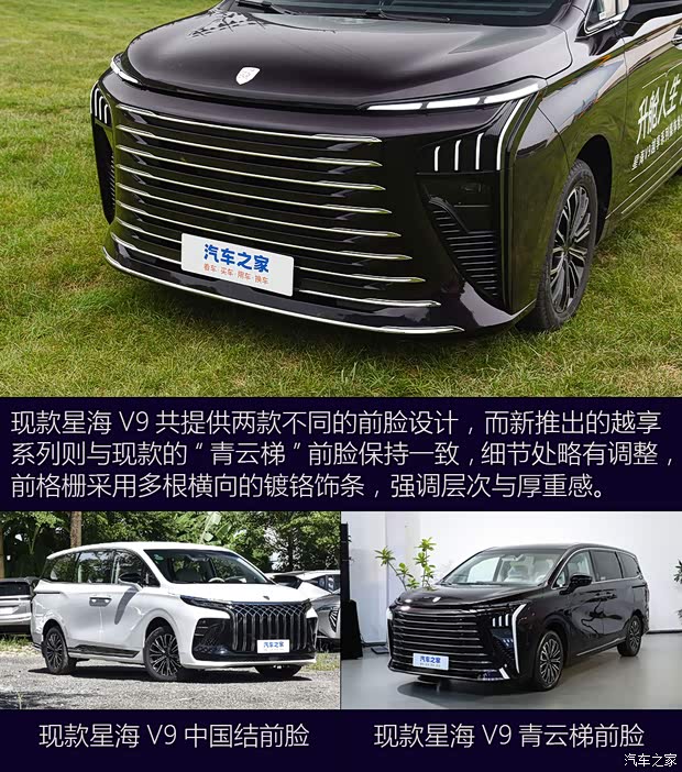 现款星海V9共有两种不同的前脸设计,分别为“青云梯”以及“中国结”,此次推出的星海V9越享系列则是采用了“青云梯”的前脸设计,但在细节处有所调整,作为一台价格亲民的MPV,使用场景丰富自然是重点。星海V9越享系列体量确实够大,气场十足,既彰显了豪华感,又不显得刻板。