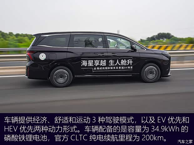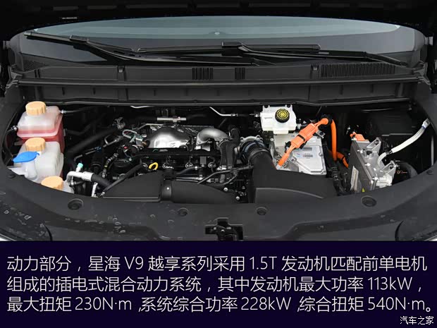 静态部分体验完,我们自然就要把它开起来试试。星海V9越享系列采用的是1.5T发动机匹配前单电机的插电式混合动力系统,其中发动机最大功率为113kW,最大扭矩230N·m,前电机最大功率150kW,最大扭矩310N·m。