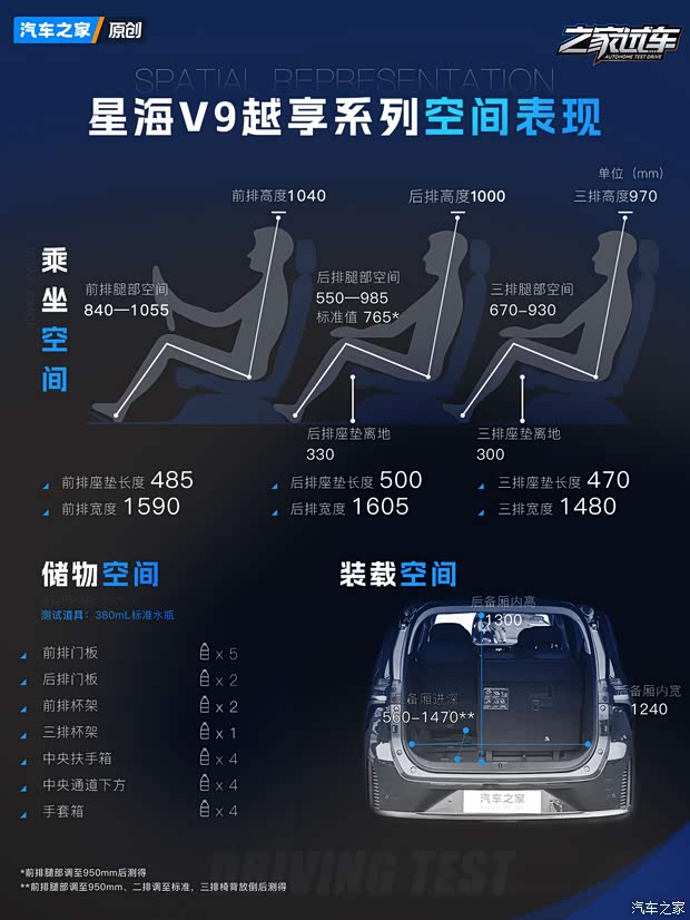 3后备厢空间巨大既然主打经济和实用性,自然配置方面也不能要求太多,像是后排小桌板和冰箱这类配置,在星海V9越享系列上并没有配备,还是略显遗憾。车内储物空间表现也只能算是中规中矩,相对来讲,前门板的储物空间十分可观。