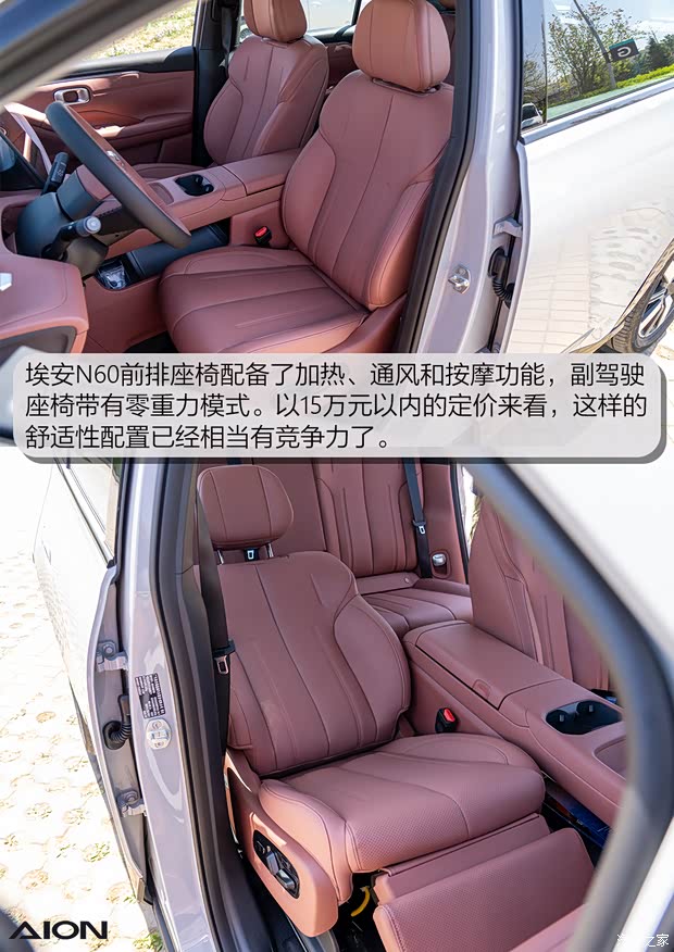2动态、辅助驾驶体验 乘坐体验前排座椅的填充物偏硬,包裹性适中,腿部承托性中规中矩。不过,在不到15万的价格区间内,埃安N60给到了前排座椅加热、通风和按摩功能,副驾驶还带有零重力座椅,舒适性配置确实比较丰富。