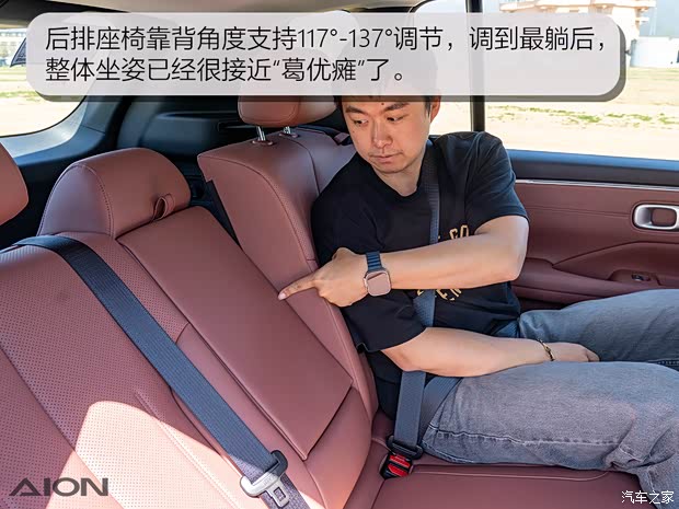 后排无论是头部还是腿部空间都很宽裕,座椅填充物同样偏硬。好在靠背角度支持117°-137°调节,调到最躺状态后,整体坐姿已经很接近“葛优瘫”了。