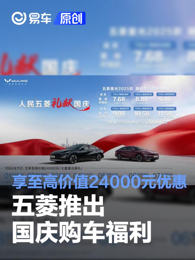 易车讯 9月30日,五菱汽车官方宣布推出“人民五菱,礼献国庆”购车福利:10月下订,置换补贴价7.68万元起,可享至高价值24000元「七重豪礼」,包括1000元定金抵2000元车款、全系至高10000元置换补贴、全系享4000元金融贴息等。