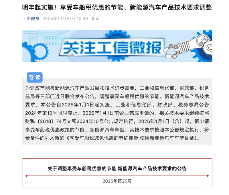 本公告自2026年1月1日起实施,工业和信息化部、财政部、税务总局公告2024年第10号同时废止。2026年1月1日前企业完成申请的,相关技术要求继续按照财税〔2018〕74号文和2024年10号公告规定执行。2026年1月1日(含)起,新申请享受车船税优惠政策的节能、新能源汽车车型,其技术要求按照本公告规定执行,符合条件的列入新的《享受车船税减免优惠的节约能源 使用新能源汽车车型目录》。