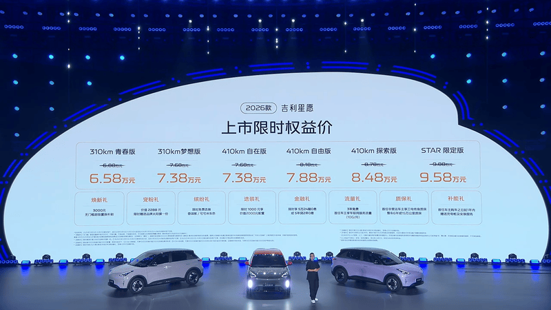 2026款吉利星愿 车型 官方指导价(万元) 上市限时权益价(万元) 310km 青春版 6.88 6.58 310km 梦想版 7.68 7.38 410km 自在版 7.68 7.38 410km 自由版 8.18 7.88 410km 探索版 8.78 8.48 STAR 限定版 9.88 9.58外观方面,新车整体延续了现款车型的造型设计,新车从“微笑”中汲取灵感,前备箱轮廓线勾勒出“微笑前脸”的造型,看上去很有辨识度。
