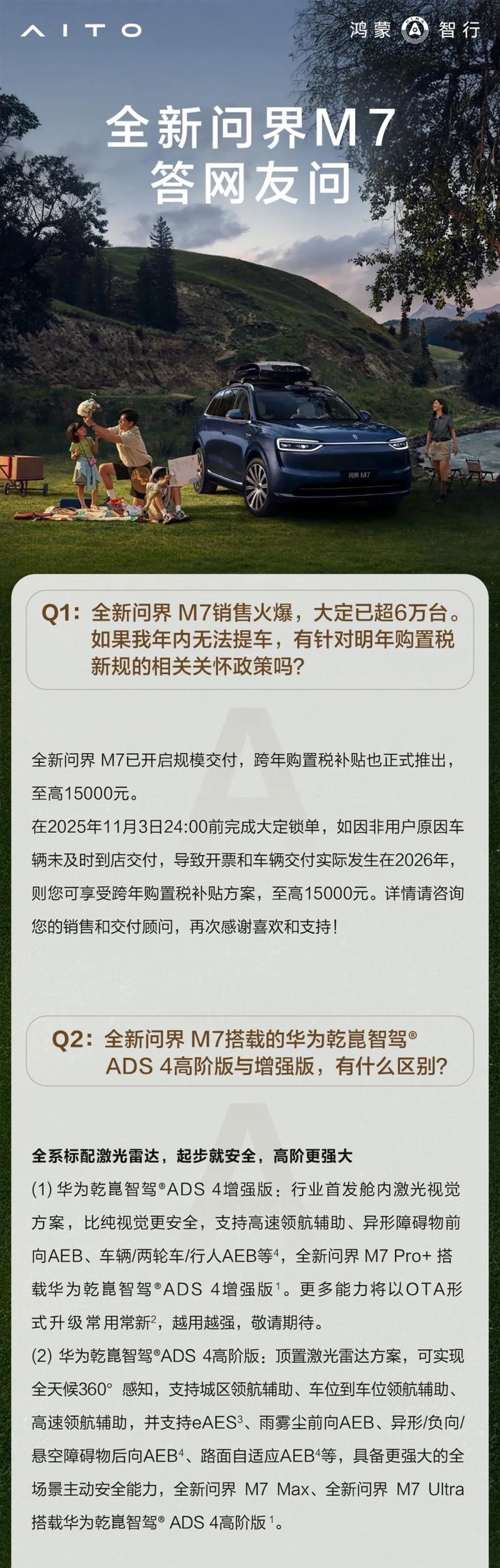 其中,关于明年购置税新规的相关关怀政策,问界官方称已推出补贴,至高15000元。在2025年11月3日24:00前完成大定锁单,如因非用户原因车辆未及时到店交付,导致开票和车辆交付实际发生在2026年,则用户可享受跨年购置税补贴方案,至高15000元。详情可咨询当地销售和交付顾问。