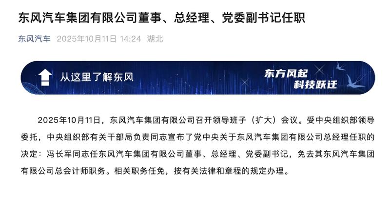 易车讯 10月11日,东风汽车集团有限公司宣布,冯长军同志任东风汽车集团有限公司董事、总经理、党委副书记,免去其东风汽车集团有限公司总会计师职务。相关职务任免,按有关法律和章程的规定办理。