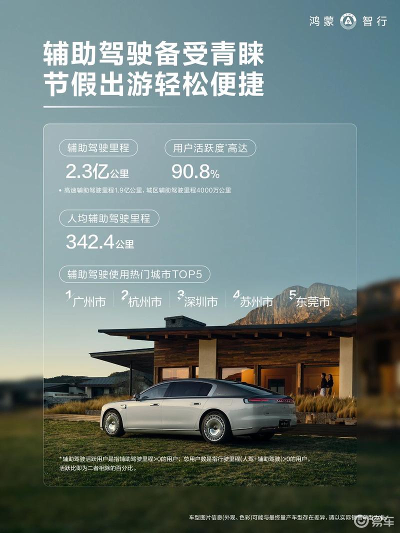 易车讯 10月12日,鸿蒙智行官方公布“国庆出行辅助驾驶使用报告”。2025国庆中秋假期间,车主们辅助驾驶(总)里程达2.3亿公里,用户活跃度达90.8%,人均辅助驾驶里程342.4公里,其中辅助驾驶热门城市TOP5分别为广州市、杭州市、深圳市、苏州市、东莞市。