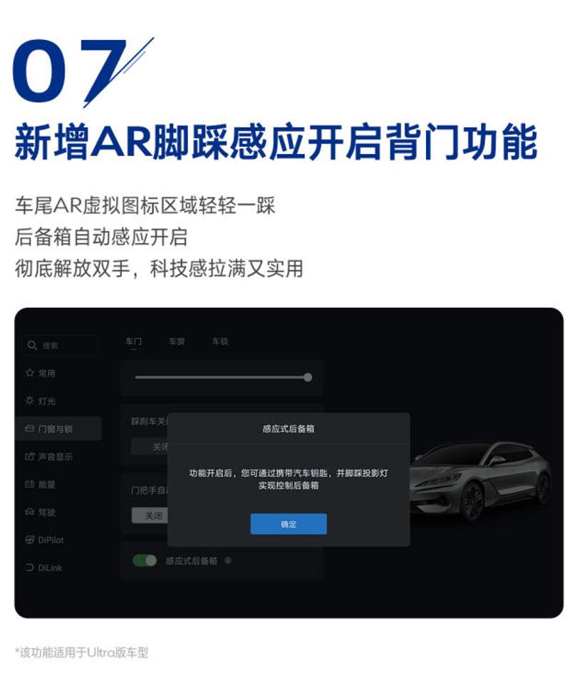 本次升级的核心亮点之一,在于将“无感”体验渗透到用车的多个高频场景。手势开前门功能上车,用户只需竖起拇指“点赞”即可开启主副驾电动门,优雅解锁进出新方式。Ultra版车型迎来了专属的AR脚踩感应开启背门,当用户双手拿着行李不便操作时,只需在车尾地面投射的AR虚拟图标区域轻轻一踩,后备箱便优雅开启。