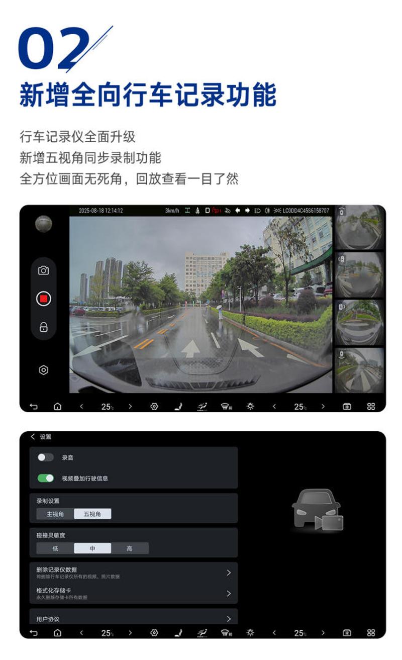 安全守护方面,本次OTA新增全向行车记录功能,在原有前视记录功能基础上,新增前环视、左环视、右环视和后环视,为用户提供多角度预览、录制及回放体验。