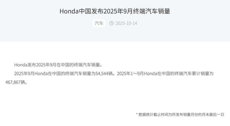 从数据上来看,本田中国今年9月销量较2024年9月下降13%,1-9月累计销量467867辆,同比下降20.45%。较8月的53339辆增长 2.2%,虽体现 “金九” 传统销售旺季的提振作用,但增幅较小。