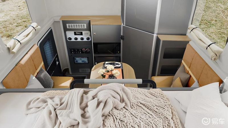 内饰方面,采用美拉德风格,质感居家氛围。金属星空灰配色,搭配肤感板材与软包,营造高级温暖的移动生活空间。并配智能座舱+温控系统,1100W暖风机18-25℃自动启停,四季如春,12.3英寸智慧双联屏,集成语音控制、在线导航等功能。外设贴心配置,拓展户外生活场景。弧形低阻顶盖降低风阻与能耗;选装3.2米电动遮阳棚,一键展开即成“户外客厅”,遮阳挡雨,实用与仪式感兼备。