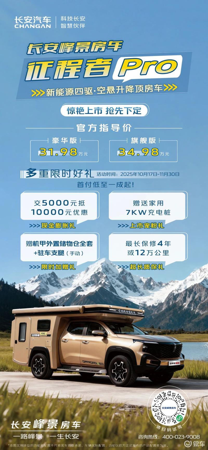 易车讯 近日,长安峰景·征程者Pro 全场景房车正式上市,新车共推出2款车型,指导价31.98-34.98万元。新车基于长安皮卡底盘打造,定位增程式房车,采用双排升顶设计,车辆具备空气悬架。