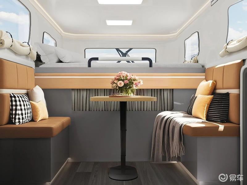 车辆采用降顶模式:城市通勤,从容入库。升降软升顶设计顶棚,降顶后车高2.2以内,轻松应对城市地库,日常通勤、商场停车毫无压力,兼顾房车功能与皮卡的灵活性。升顶模式:空间拓展,旅居升级。一键升起顶棚,即刻获得宽敞头部空间与独立休息区域,打造移动卧室,满足宿营、休闲多种场景,车辆配备独立卫生间。 新造型弧形顶盖:流线型驭风,节能与美学兼得。风阻降低,导流优化无积水,提升高速行驶稳定性,降低油耗,告别渗漏烦恼。