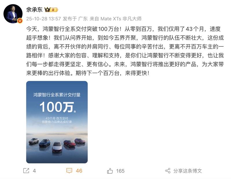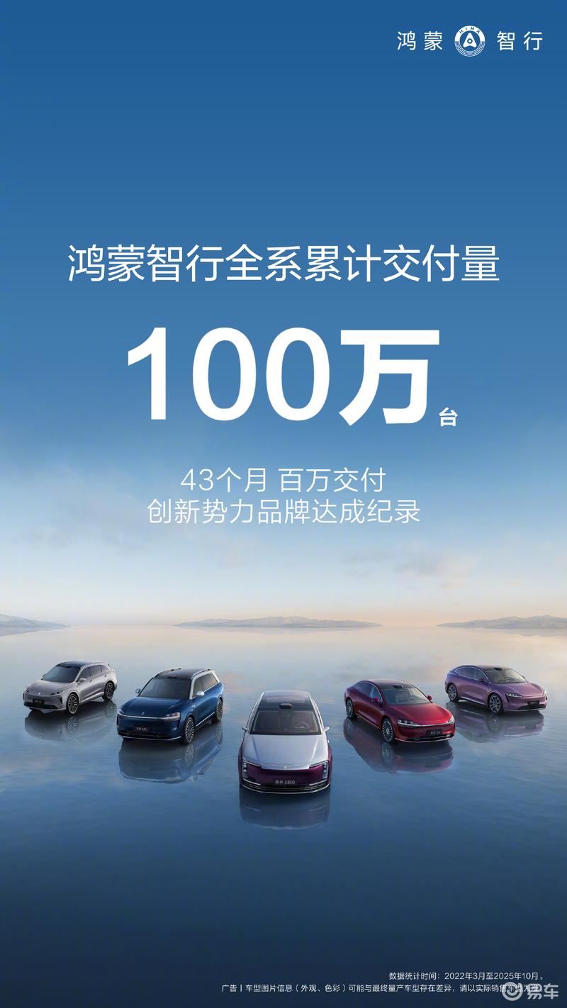 易车讯 10月28日,华为常务董事、产品投资委员会主任、终端BG董事长余承东在社交媒体上宣布,鸿蒙智行全系交付突破100万台,从零到百万仅用了43个月。未来,鸿蒙智行将推出更好的产品,为大家带来更棒的出行体验。