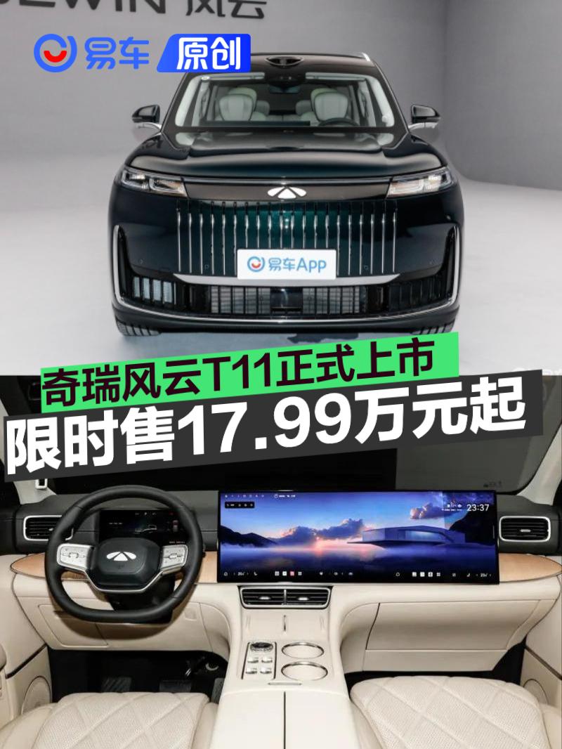 易车讯 10月30日,奇瑞风云T11正式上市,包含四款车型,官方指导价区间18.99-24.99万元;超级增换购限时抢鲜价区间17.99-23.99万元。新车搭载1.5T增程动力系统,采用六座布局,纯电续航里程达到220km,配备激光雷达,具备NOP城市驾驶辅助。