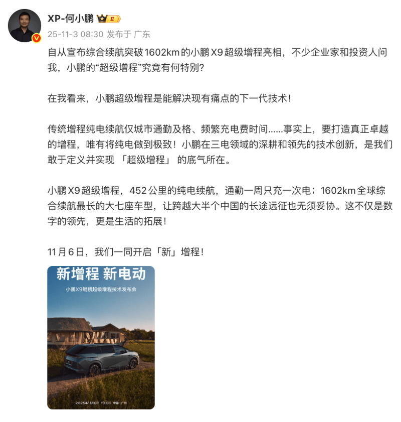 易车讯 11月3日,小鹏汽车董事长何小鹏在微博上宣布小鹏X9增程版将于11月6日迎来正式发布。新车将搭载鲲鹏超级增程技术,纯电续航452公里,综合续航达1602公里。